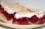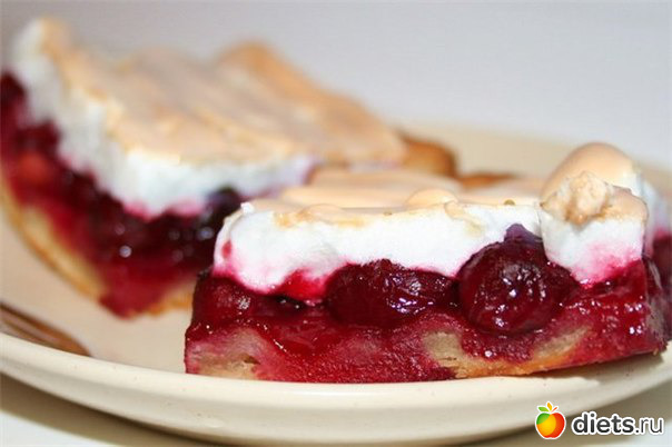4. Когда пирог пропечется практически до готовности, достать из духовки. Взбить белки и равномерно распределить их на вишни. Поставить в духовку, пока белок не приобретет нежно-бежевый оттенок (примерно 4 минуты). Нарезать в горячем виде.