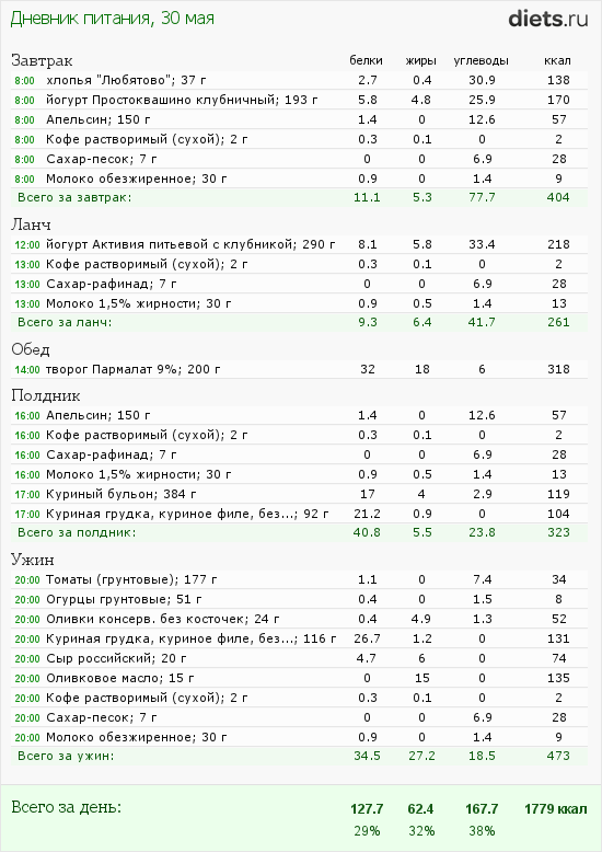 На первый обед ела творог Пармалат и йогурт. На второй обед куриный бульон с курогрудью.