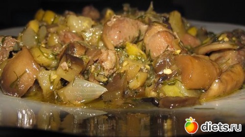 6. По готовности сердечек добавляем к ним баклажаны и смесь шампиньонов. Все это сдабриваем специями. Добавляем немного кипятка (при необходимости) и тушим всю эту вкусноту около 10 минут на маленьком огне под крышкой.