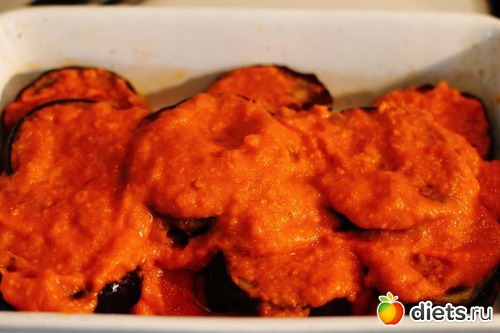 6) В небольшом жароупорном блюде разложить в один слой часть кружочков баклажанов. Залить ½ соуса и выложить остальные баклажаны и сверху залить оставшимся соусом. (должно быть минимум 2 слоя, это зависит от Вашего жароупорного блюда)Поставить в разогретую духовку.