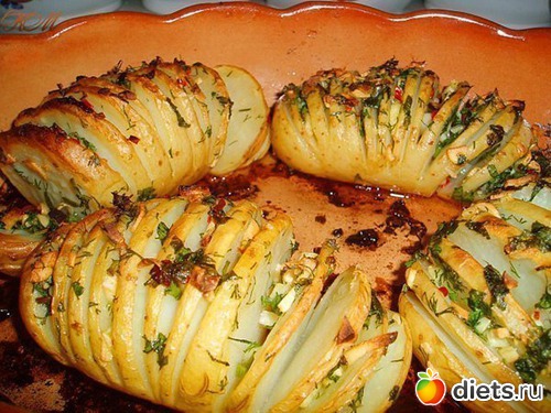2. Надрезаем картошку ломтиками толщиной 2-4 мм не до конца, а так, чтобы она могла развернуться веером. Для такого нарезания картофелину удобно поместить на ложку - края ложки не дадут прорезать картофелину до конца.