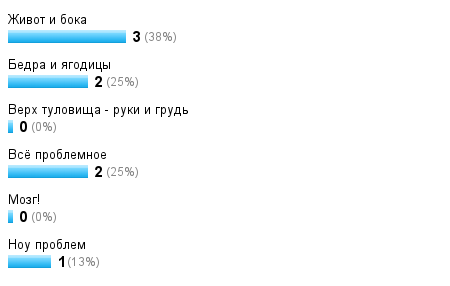 Вчера моя тренер по йоге заметила, что я похудела, и муж говорит, что заметно. НО! Ноги не фига не худеют, похудела талия, бока и живот, а бедра как были так и остались. Хотя я на них упор в упражнениях делаю, и вакуумный массаж на них с антицеллюлитным кремом. Вполне может быть, что у меня будет совсем плоский живот, уже ребра торчат, сдуется грудь, а бедра как были так и останутся.
