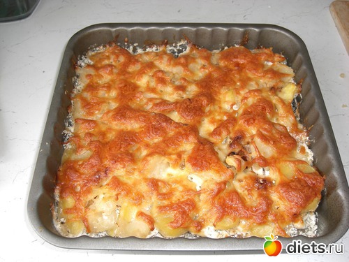 4. Сыр натереть на терке. В форму для запекания (подойдет любая форма - керамическая, глиняная, стеклянная) выложить половину картофеля. Смазать сметанным соусом.