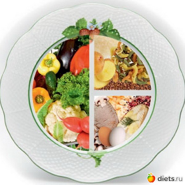 Правило тарелки Очень хорошая диета для удержания сброшенного веса — это так называемое "правило тарелки". Идея этого правила в том, что есть можно все, что нравится, но с одним условием — делите тарелку (обычная тарелка для второго блюда диаметром 25 см) на две части, затем одну половину еще пополам. Половина тарелки всегда должна быть заполнена овощами или фруктами, четверть белковой пищей, и еще четверть углеводной. И это правило нужно соблюдать при каждой еде.
