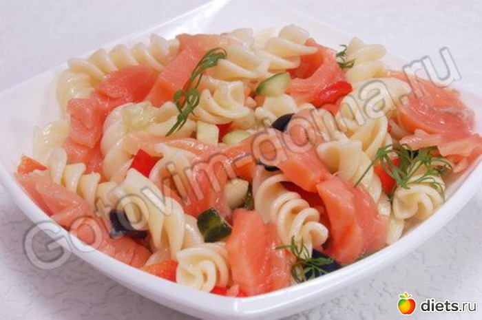 Соединить вместе макароны, рыбу, болгарский перец, огурец, маслины.