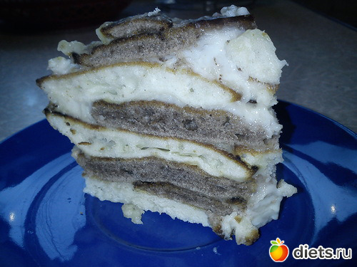 Теперь осталось собрать торт - в глубокую тарелку выкладывать слоями пооччередно белые и шоколадные лепёшки, густо промазывая каждый слой кремом.