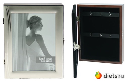Ключица выполнена в виде прямоугольного ящика, крышка которого представляет собой фоторамку, куда можно вставить любимую фотографию. Внутри - 6 металлических крючков, на которые подвешиваются ключи.