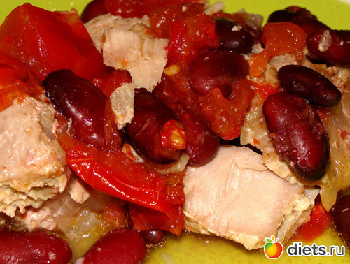 выкладываем в горшочек слоями: рыба - лук с чесноком - фасоль - помидоры.