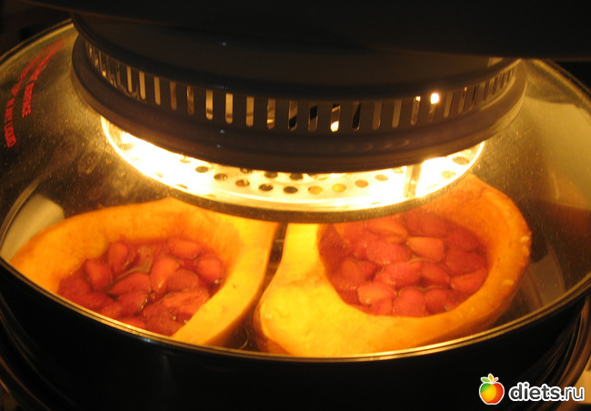 Тыкву режем на две половинки, вычищаем от семян, ложим замороженную клубнику, накрываем сверху фольгой и в аэрогриль на 20 минут при температуре 205 градусов, затем снимаем фольгу и допекаем при температуре 230 градусов 10 минут.