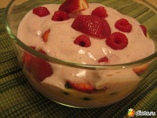 Взбить яичные желтки с сахарным песком, мукой, ванилином (или цедрой) и молоком. Постоянно помешивая, поставить на огонь, не доводя до кипения, чтобы крем загустел. Охладить крем. В миску положить нарезанные фрукты, залить холодным кремом, взбитыми белками и перемешать с 2 столовыми ложками сахарного песка. Поставить в духовку на несколько минут до образования золотистой корочки. Подавать в охлажденном виде
