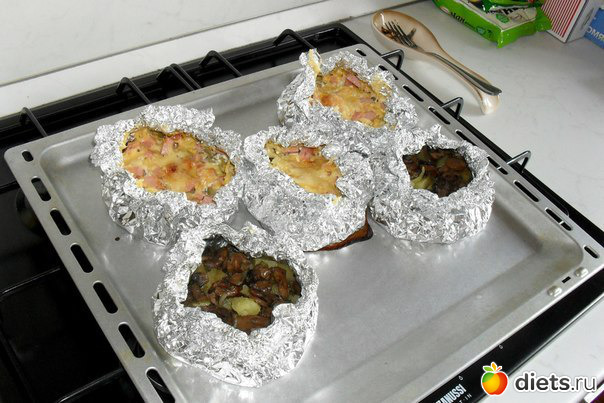 Фольгу завернуть кулечками и отправить "пиджаки" в разогретую духовку на 30 мин (иемпература около 170-180 градусоов). Затем кулечки вынуть и слегка развернуть. чтобы сверху получилось отверстие, после чего снова отправить в духовку на 15-20мин.
