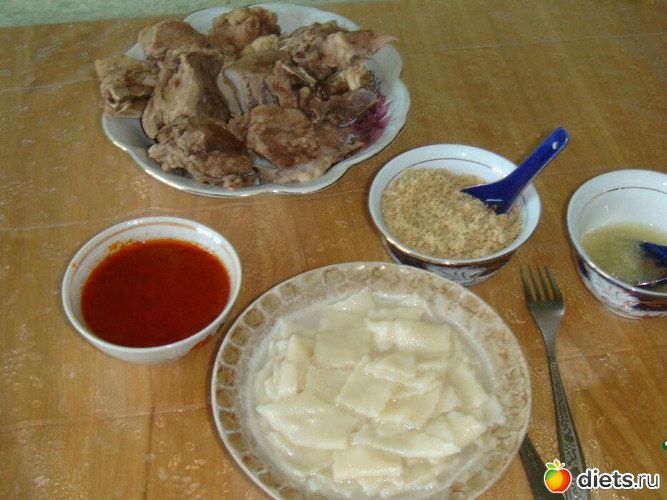 Лапша подаётся отдельно от мяса в большой деревянной чаше. После лапши каждому отдельно в маленьких чашках подается бульон с курутом.