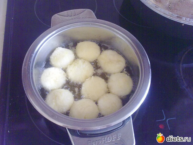 Опускаем в раскаленное масло. В процессе готовки увеличиваются в размере. Вынимаем, когда шарик золотистого цвета. Примерно мин 3-4. Огонь ближе к сильному, но не самый сильный.