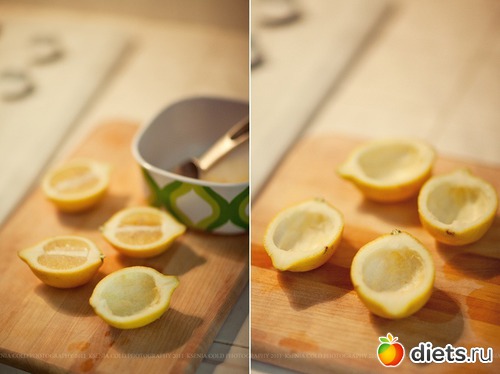 Нужно нарезаем лимонные половинки и очищаем их от мякоти. Делаем это аккуратно, чтобы не повредить шкурку. Затем берем свечи. Надавливая на центр металлической формочки выдавливаем из нее саму свечку. Затем аккуратно вытаскиваем фитиль с нижней стороны свечи. Он прикреплен к металлической плашке, что очень удобно. Тут важно действовать медленно, чтобы плашка не оторвалась, а фитиль не остался в свече.