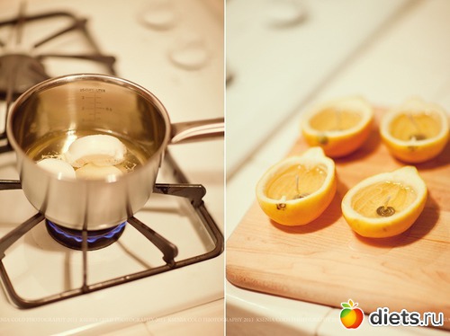 Фитили ставим в наши "лимонные" формочки. Далее в небольшой кастрюльке плавим воск. Как только он полностью растаял, разливаем его по лимонным половинкам. Ждать дольше не нужно, потому что слишком высокая температура воска может повредить шкуркам лимона, и свечки будут долго застывать.