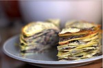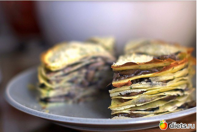 Блинчики проложите начинкой. Сверху присыпьте тертым сыром.