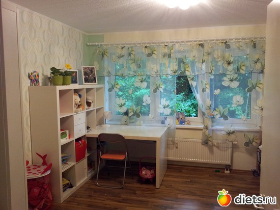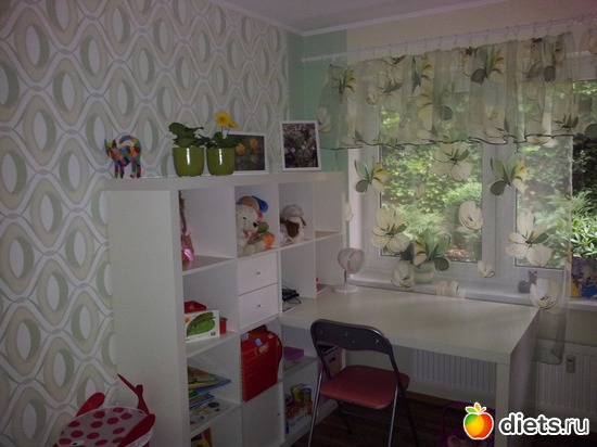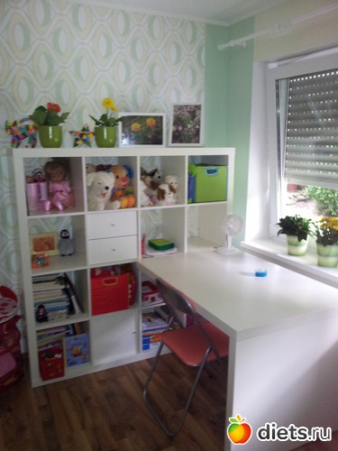 Стол тоже считаю удачей. После долгих поисков и рассказа моей подруге чего бы я хотела, она воскликнула : "так в Икее такой же стоит". В Икее я все обсмотрела, но не видела подобного, тогда мы поехали вместе и спланировали такого плана "стенку", которая очень удачно гармонирует со шкафом. Кровать тоже из Икеи будет.. и еще полки хотим докупить на противоположную сторону ( там мятные полоски на теплом желтом фоне).