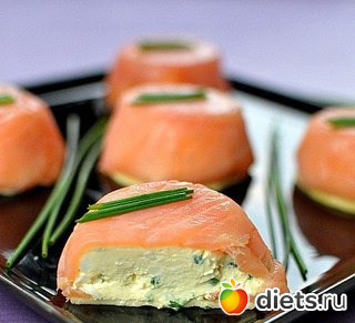 Далее выкладываем начинку в каждую формочку и закрываем выступающими концами рыбы как конверт. Пленку тоже завернуть.