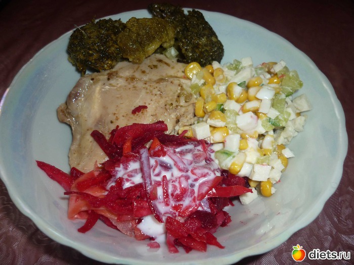 Обед - курица с брокколи, салат с крабовыми палочками и венигрет, политые кефиром