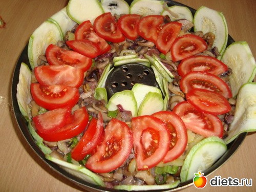 Нарезать помидоры 200гр посолить, поперчить, смазать сметаной 100гр с чесноком и укропом, закрыть кончиками кабачков, покрыть слоем сметаны. Поставить в духовку и тушить до готовности.