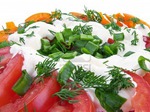 Нарезать репчатый лук полукольцами. Помидоры - дольками. Зелень измельчить. Простоквашу смешать с тертым хреном и зеленью... Читать полностью