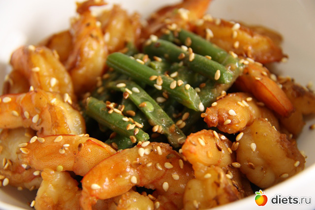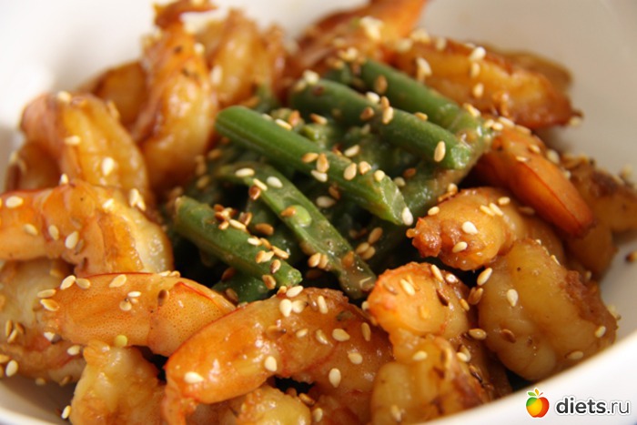 7. Добавляем креветки и выкладываем на блюдо, как нам нравится. Не забываем украсить кунжутными семенами:-)
