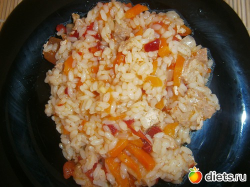 В обед приготовила плов со свининой и овощами, морковью, красным перцем и помидоркой. Получилось очень вкусно, заодно и мужа накормлю. Сама мясо из плова не ела. Вот фото.