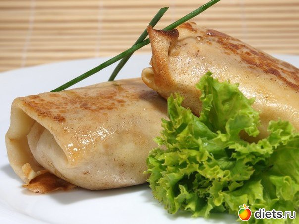 Выложите готовую начинку на более прожаренную сторону блина и сверните его конвертиком.