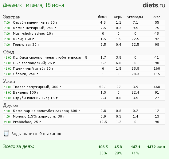 Сегодня я была примерной девочкой, хотя на перекусы у меня времени не было, я все равно питалась правильно, и не переела, и калории добрала )))