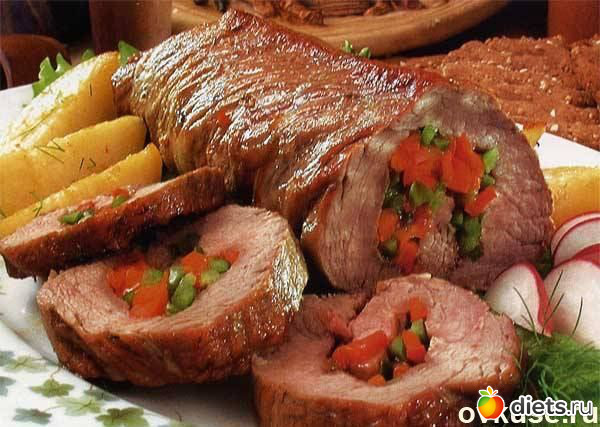 3. При подаче нарежьте широкими ломтиками поперек, гарнируйте жареным картофелем, свежими, консервированными овощами. Отдельно подайте соус хрен с уксусом. Оформите зеленью.