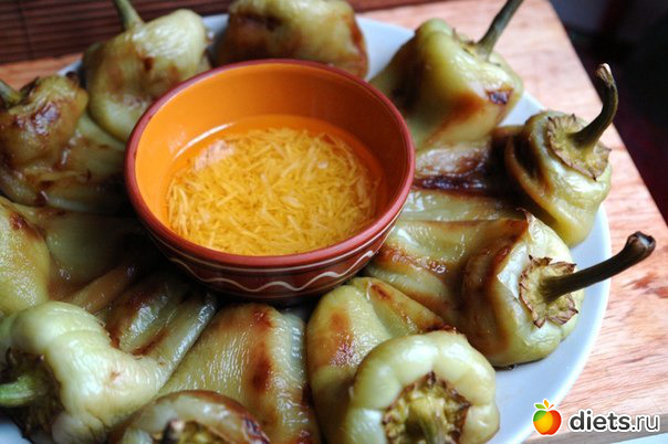 9. Выбираем большую плоскую тарелку или блюдо. По центру тарелки кладем плошечку с соусом, а вокруг прожаренный перец. Перец сверху слегка посыпаем солью.