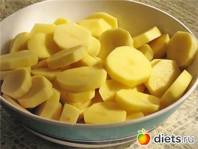 Очищенный картофель режем крупными дольками и отвариваем в подсоленной воде до готовности.