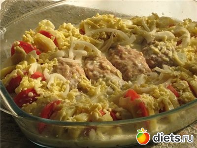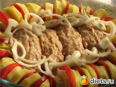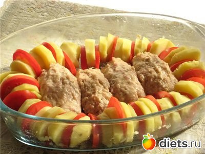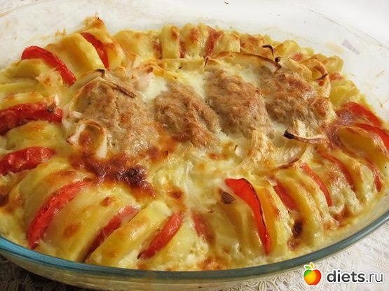Слова автора: " Представляю Вам красивое и вкусное блюдо из куриных котлеток и картофеля с помидорами. Готовить его не сложно и недолго, а результат праздничный!"