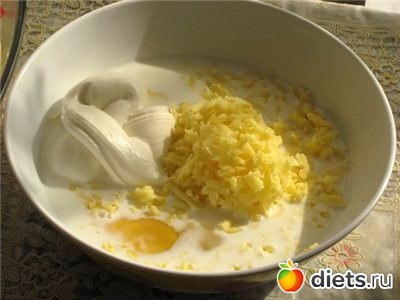 И заливаем заливкой из сыра, яйца, сметаны и молока.(комментарий от МЕНЯ: думаю, можно обойтись без майонеза)