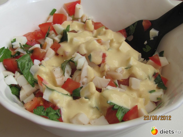 Полдник: салат из консервированных кальмаров, белков, помидоров с дюкан-майонезом