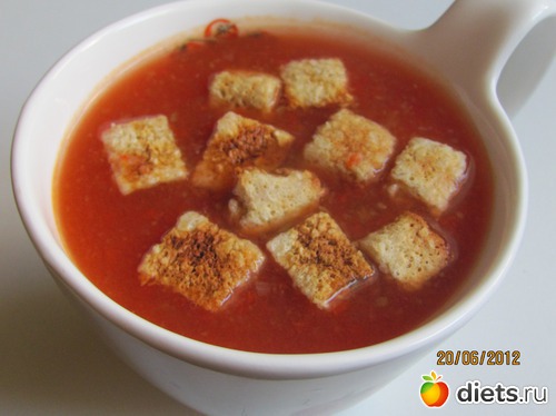 Ужин:гаспаччо с сухариками из отрубей, зеленый чай с молоком.