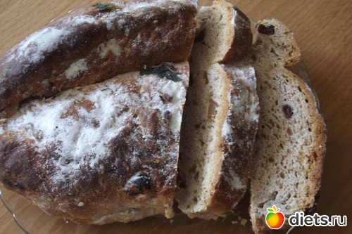 А потом насыпала в ХП 250 г муки, 50 г сахара, по 200 г орехов грецких и изюма (предварительно замоченных в 2 ст.л. коньяка), 200 г сл.масла и опару. Поставила режим и спокойно занялась своими делами. Через 3 ч 15 мин печка пропищала мне, что тесто готово к дальнейшей переработке.