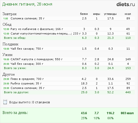 По ккалошкам вышло мало, а привес есть - 200 гр. Думаю это от того, что на ночь дело было ближе к 12 и дальше, поэтому вода еще сойти не успела, да и в тубзик я еще не ходила