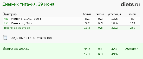 Сегодня, каюсь тоже позволила себе отступить, так хотела я этот сникерс долбанный, в общем съела 34 гр. сегодня на завтрак