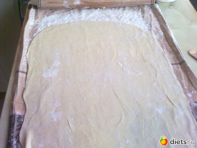 На столе раскладываем чистое кухонное полотенце. Припудриваем полотенце мукой и рукой пытаемся распределить муку по всему полотенцу. Вынимаем тесто из холодильника. И - ответсвенный момент: наша задача раскатать тесто по форме полотенца! Да - раскатываем по припорошенному полотенцу тонко-тонко.