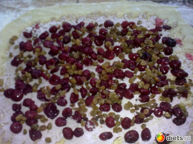 На изюм - немного отжимаем и выкладываем вишню. Если есть лепестки миндаля - можно по вишне выложить совсем немного лепестков. Поверх вишни - притрушиваем сахаром либо сахарной пудрой, можно добавить корицы и тертой цедры лимона)