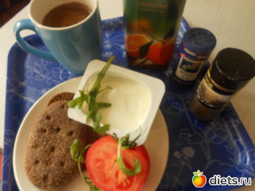 Завтрак - 100 г апельсинового сока, 2 кусочка ржаной краюшки, намазанной творожком 0%, с ломтиками помидора, кофе.
