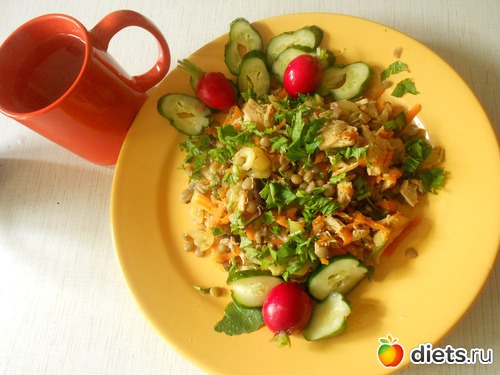 Обед - 150 г куриной грудки с овощами и чечевицей (по плану было 200 г курицы + салат, но план пришлось скорректировать - курогрудь резко закончилась, в магазин бежать было лень, а чечевица - тоже белковый продукт - осталась от чечевичника):