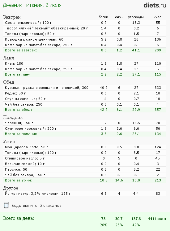 Поражена, что довольно длинное меню в сумме дало всего 1111 ккал!