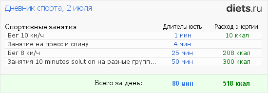 Вечером ощутила потребность в силовых, откопала у себя любимый некогда комплекс "10 minutes solution" на ноги, руки, ягодицы, пресс и плюс растяжка. Думала, будет аццки тяжело - не, нифига. Очень спокойно, легко и без одышки всё прошло, даже удивительно. Это и порадовало и огорчило - я надеялась, что заставлю себя более тяжело заниматься. В следующий раз попробую Envy.