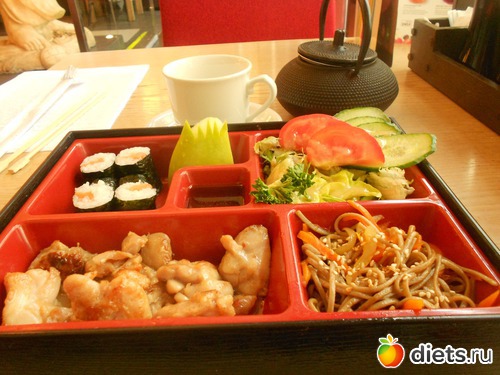 Обед - бенто-бокс (куриное филе, яки-соба, салат-микс без заправки, ролл с лососем, кусочек яблока, чай):