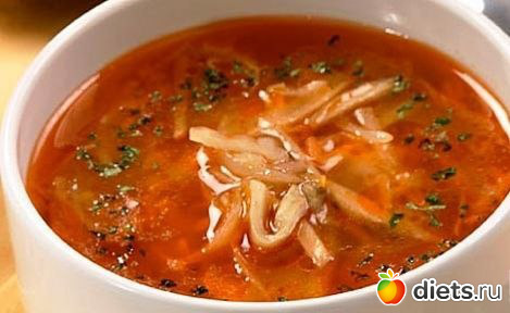 Грибы, предварительно замоченные, отварите, нашинкуйте и обжарьте на части масла. Бульон процедите. Капусту отожмите от рассола, прогрейте, добавив часть масла, влейте немного бульона и тушите 10 минут. Муку подсушите, охладите, затем разведите частью грибного бульона. Лук и коренья, нарезанные соломкой, обжаривайте на оставшемся масле 7-10 минут, добавьте томатное пюре и обжаривайте ещё 5 минут. В бульон положите капусту, грибы, доведите до кипения, добавьте мучную пассеровку, лук, коренья и томатное пюре, соль, сахар, перец и лавровый лист, вари