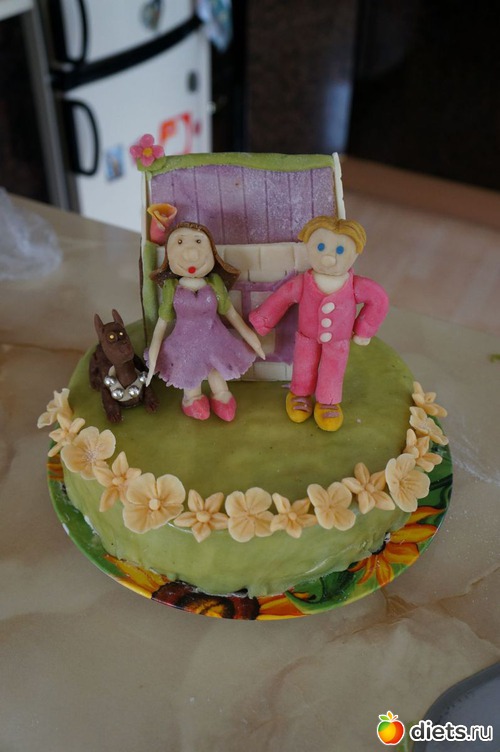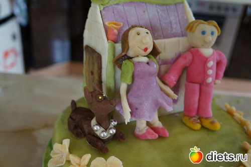 На торте Алиса, Дима, их пес доберман и новый дом))