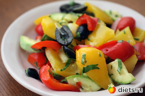 Измельчаем петрушку, маслины режем пополам. Готовый лук очищаем, режем на полоски. Перец нарезаем небольшими кусочками. Заправляем, солим по вкусу и перемешиваем.