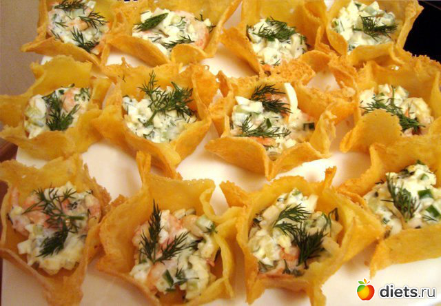 Отлично подойдет, как начинка, простейший салат их креветок с огурцом и укропом.